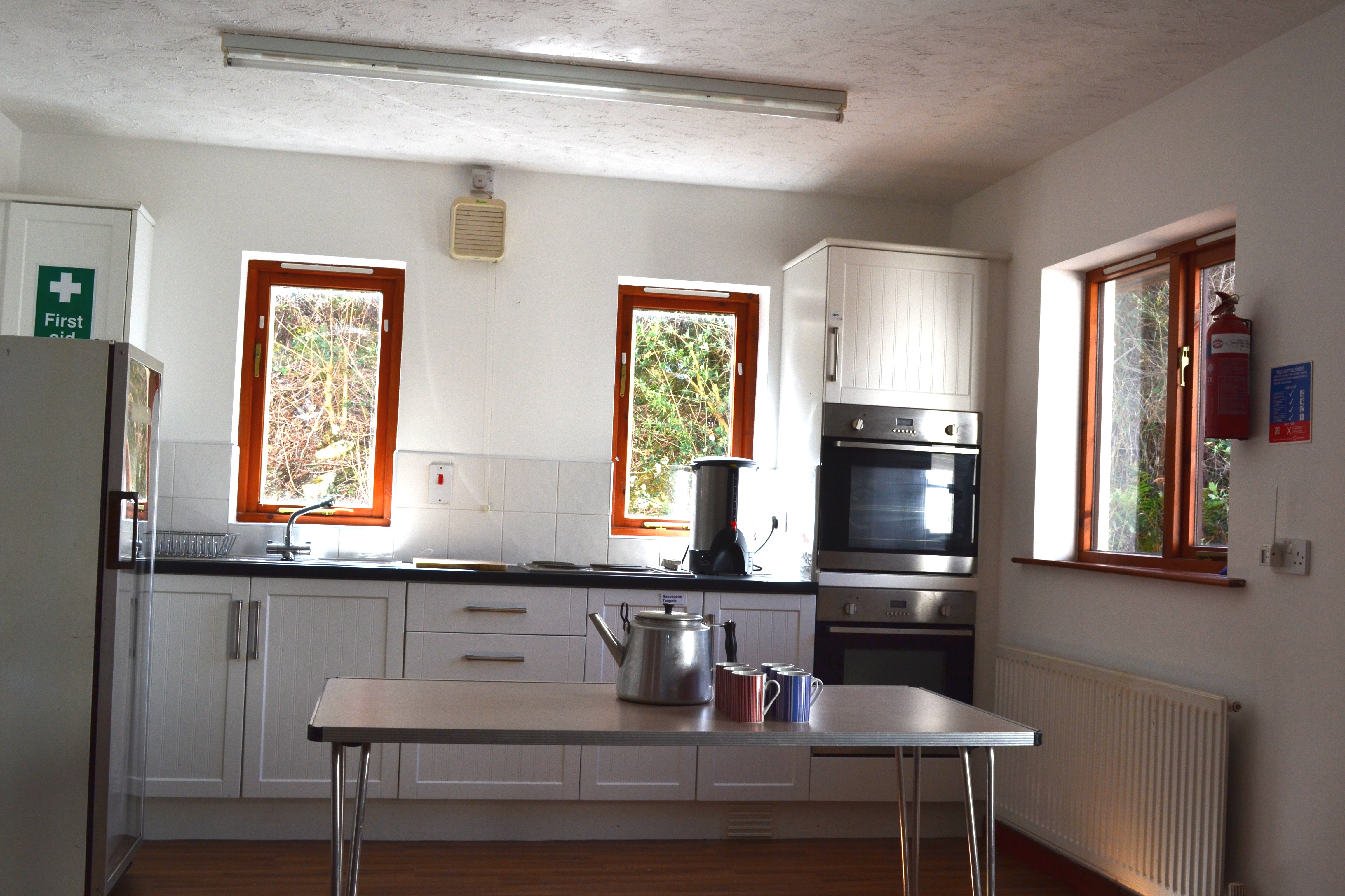 The kitchen is a generous size and well equipped. There is plenty of crockery and cutlery and a range of pots and pans. There is an under-counter fridge and a large chiller as well as a four-ring electric hob two eye-level ovens and a microwave. A serving hatch connects the kitchen to the main hall.