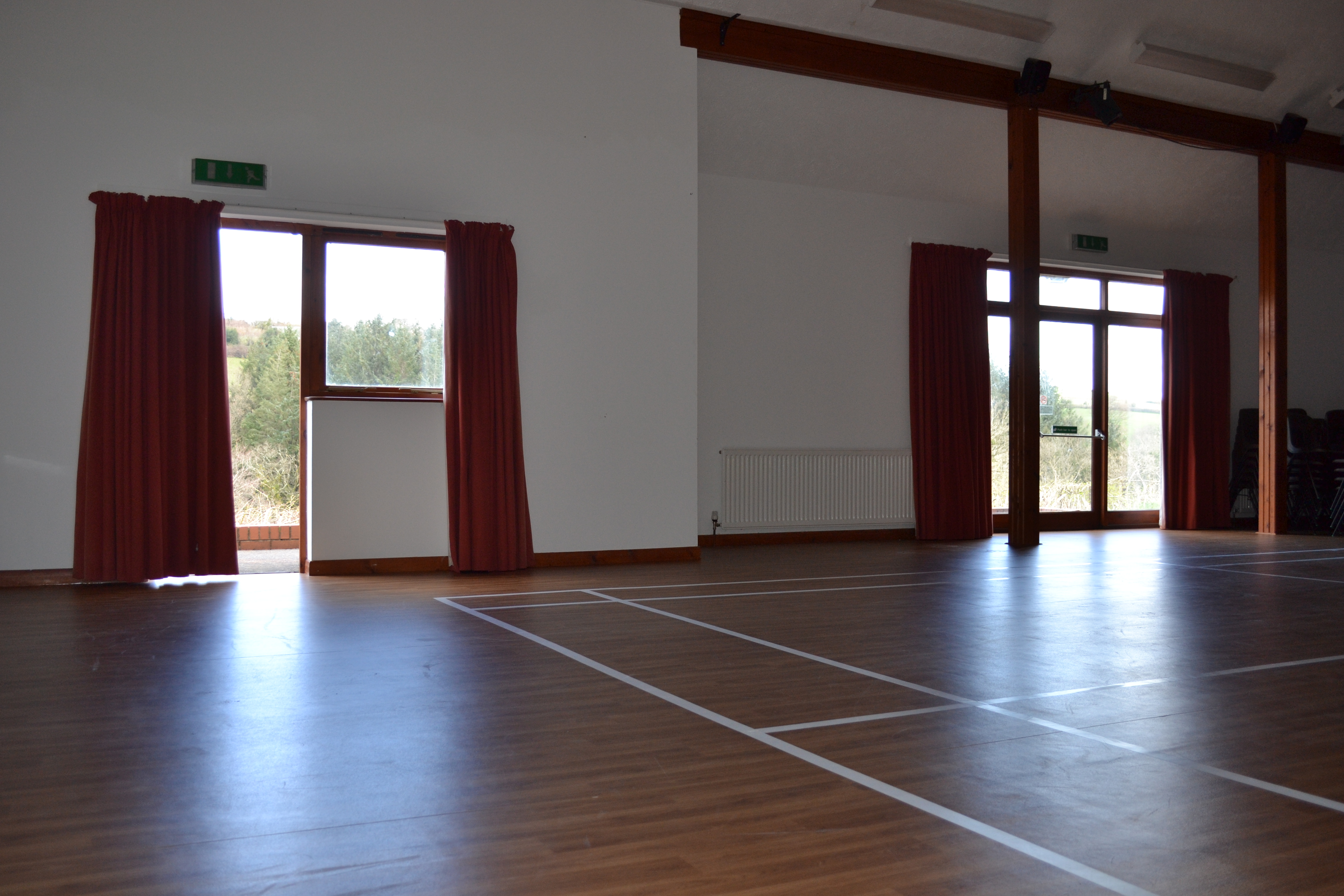 This is a large space measuring 17m x 9m. Several windows and doors take advantage of the lovely landscape in which the hall sits. The hall can comfortably accommodate around 150 people standing (or dancing) and about 100 seated.